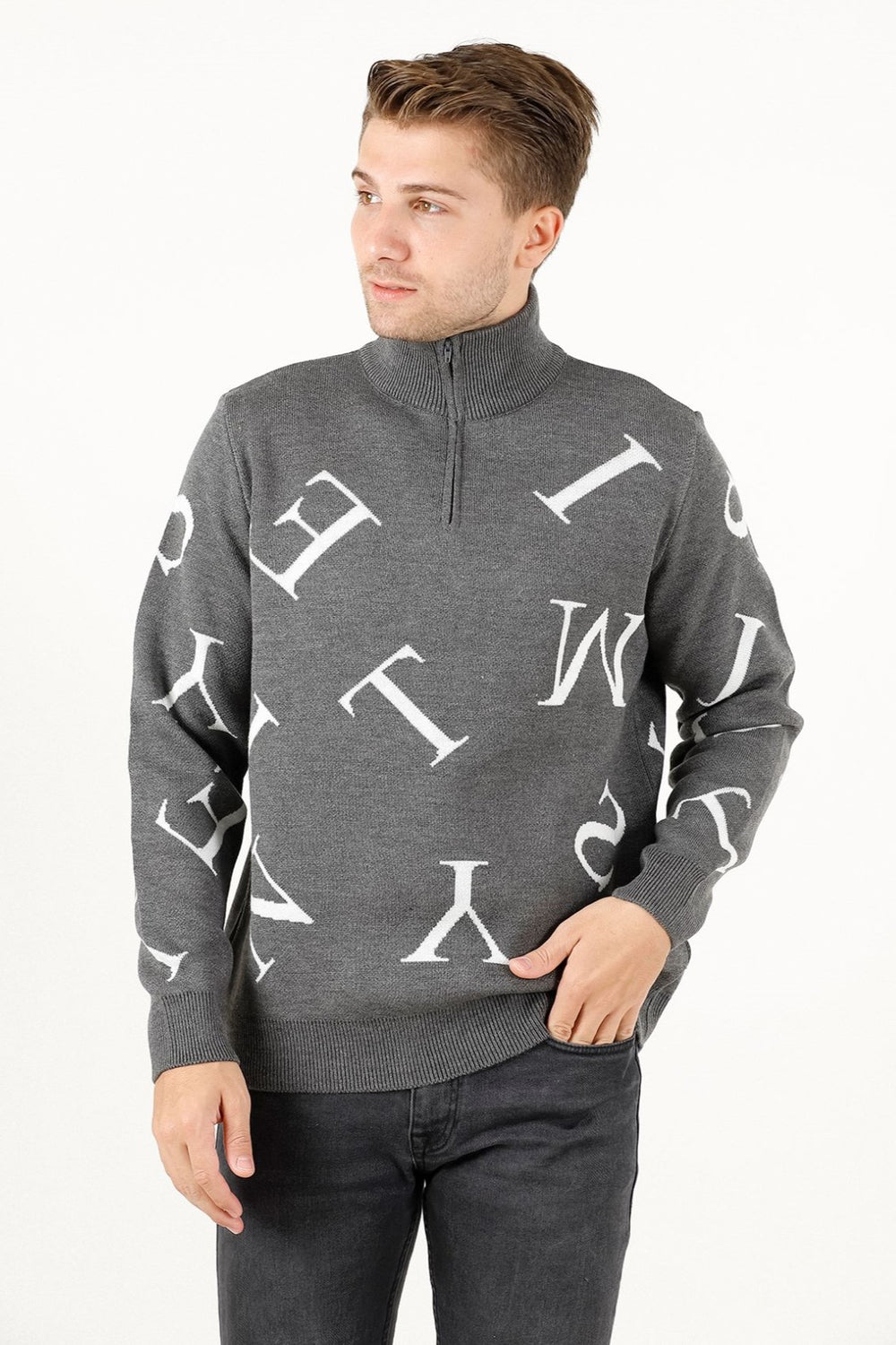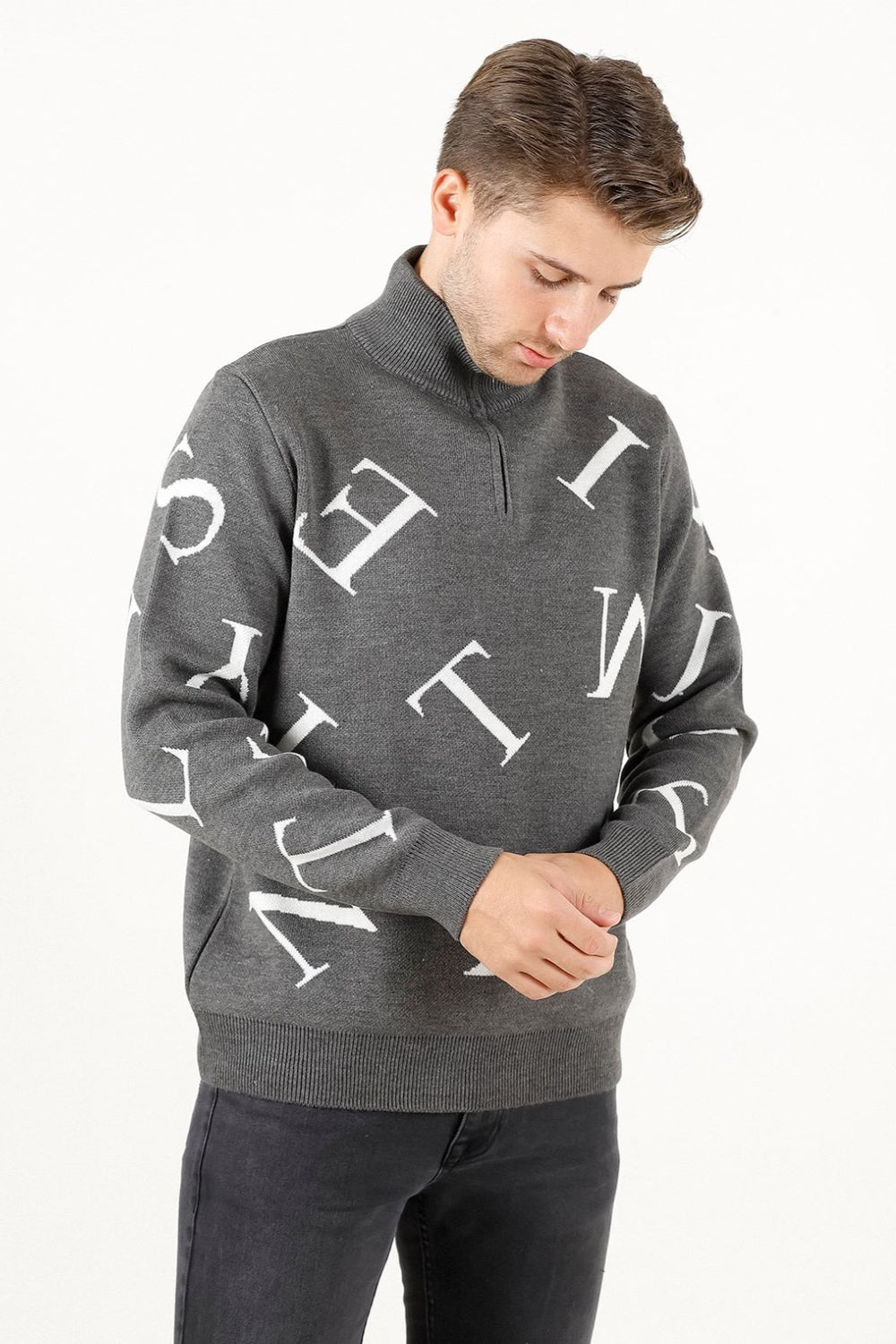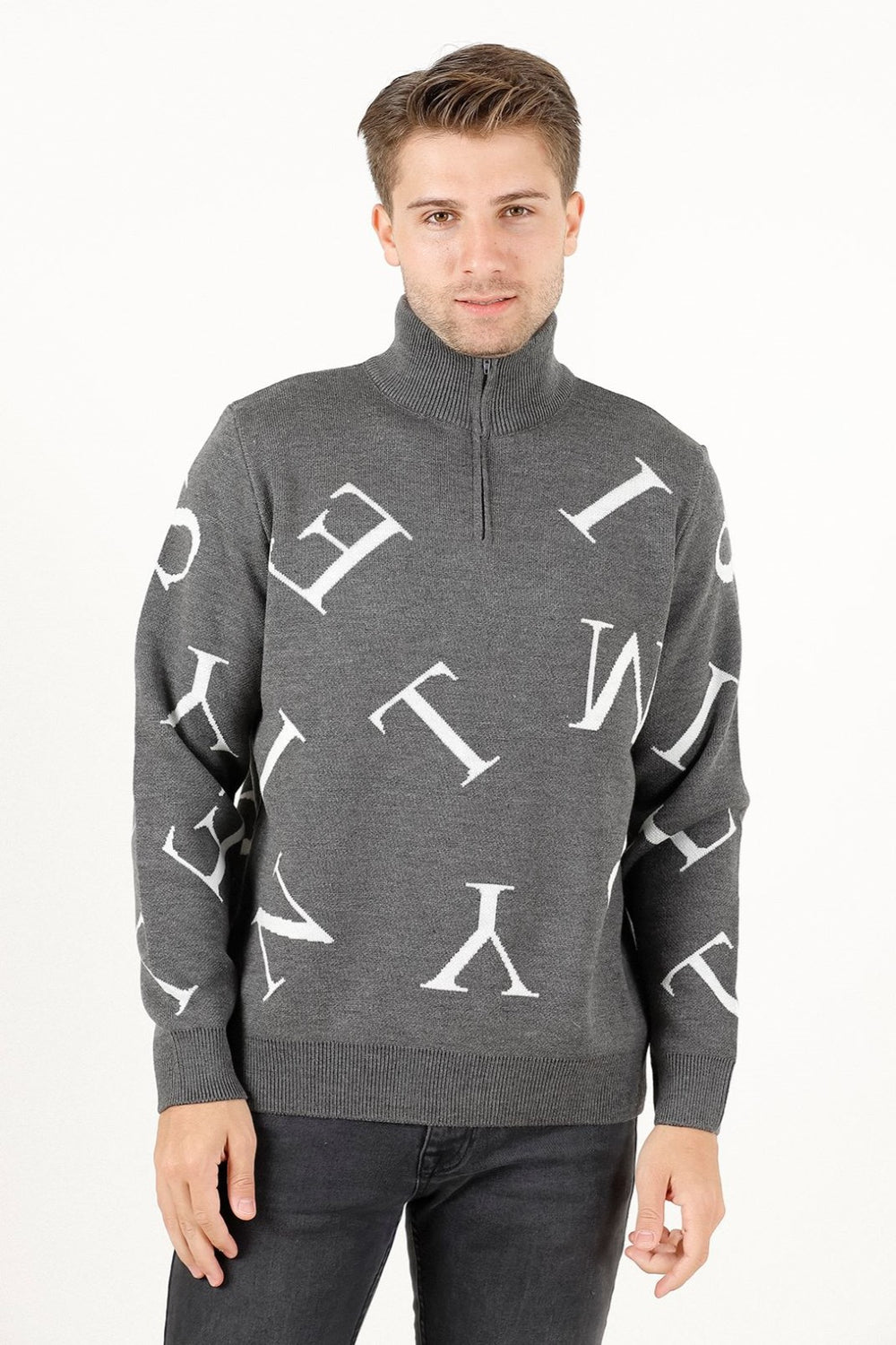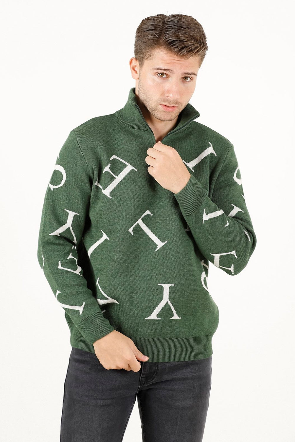 Fermuarlı ve harf detaylı triko kazak, dik yaka tasarımı ve regular fit kalıbıyla modern ve rahat bir stil sunar. Pike jakar örgüsü ve orta kalınlıktaki yapısıyla kış aylarında kullanıma uygundur.