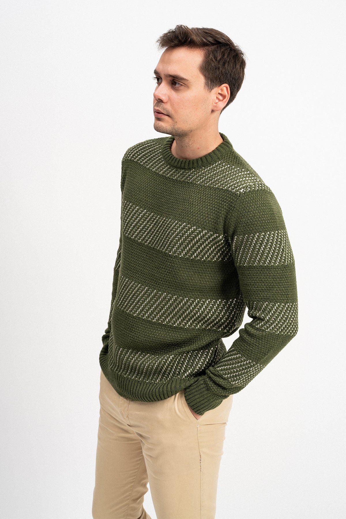 İki renkli tasarımıyla öne çıkan bu triko kazak, pirinç örgü dokusu ve bisiklet yaka detayıyla modern bir görünüm sunar. Regular fit kalıbıyla rahat bir kullanım sağlarken, orta kalın yapısı sayesinde kış aylarında kullanıma uygundur.