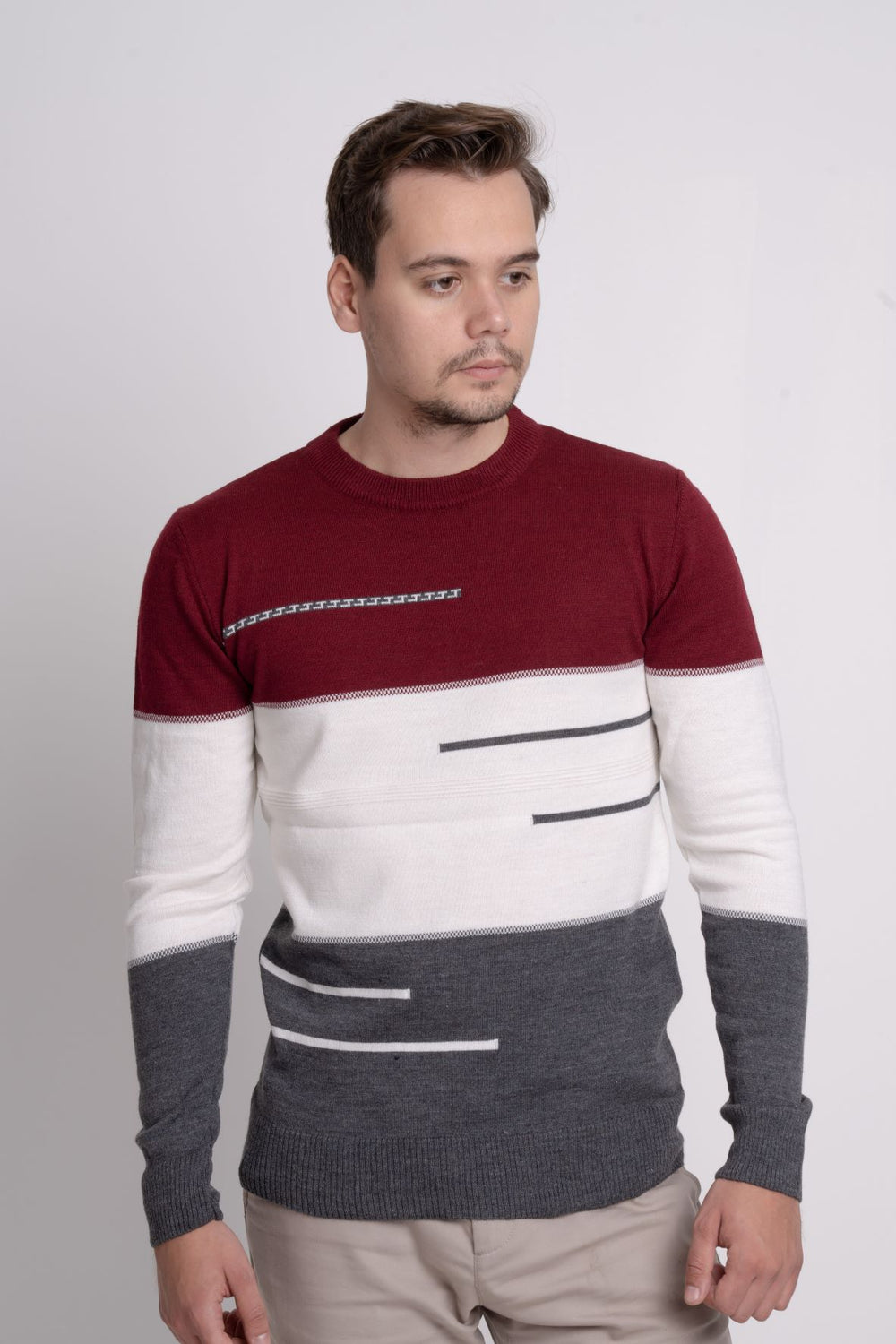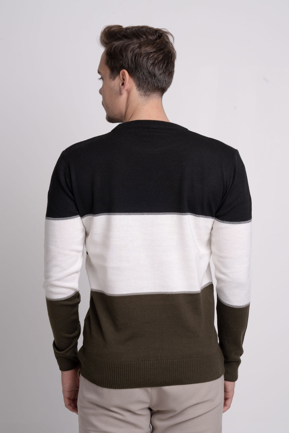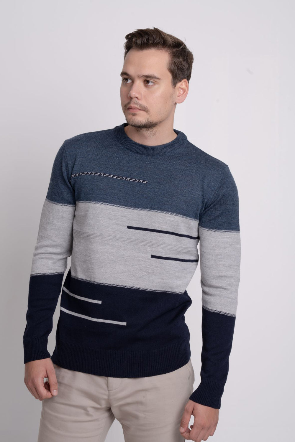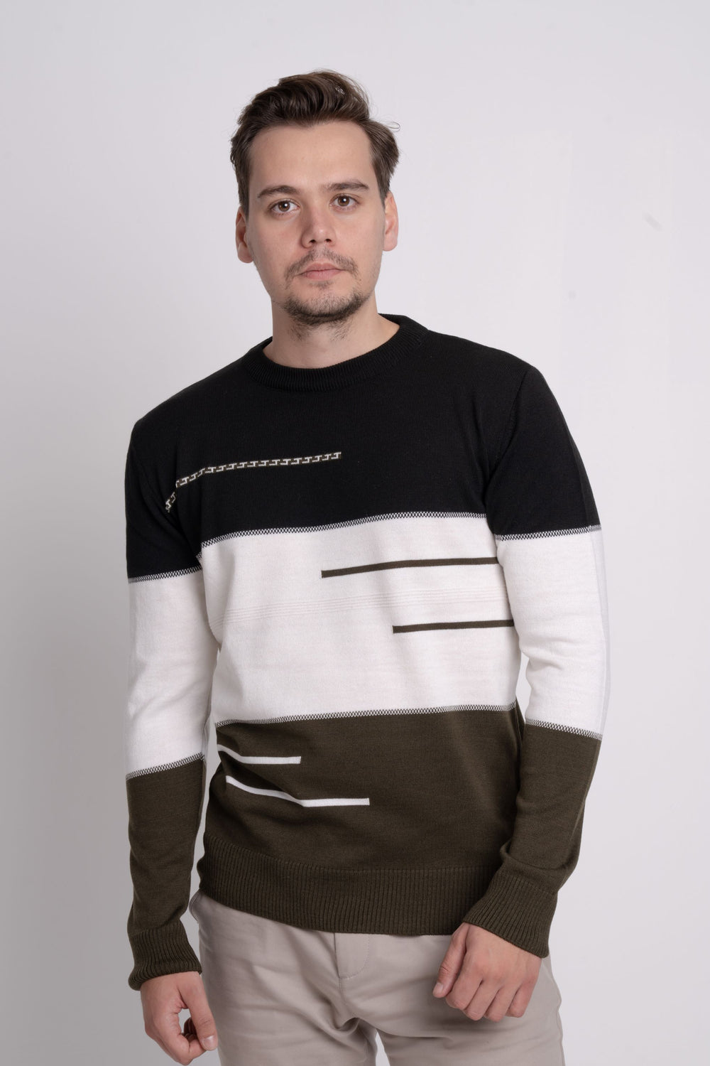 Renk bloklu üç renkli ince triko kazak, bisiklet yaka tasarımı ve regular fit kalıbıyla modern ve rahat bir stil sunar. İnce ve baharlık yapısı sayesinde sezon geçişlerinde kullanım için idealdir.
