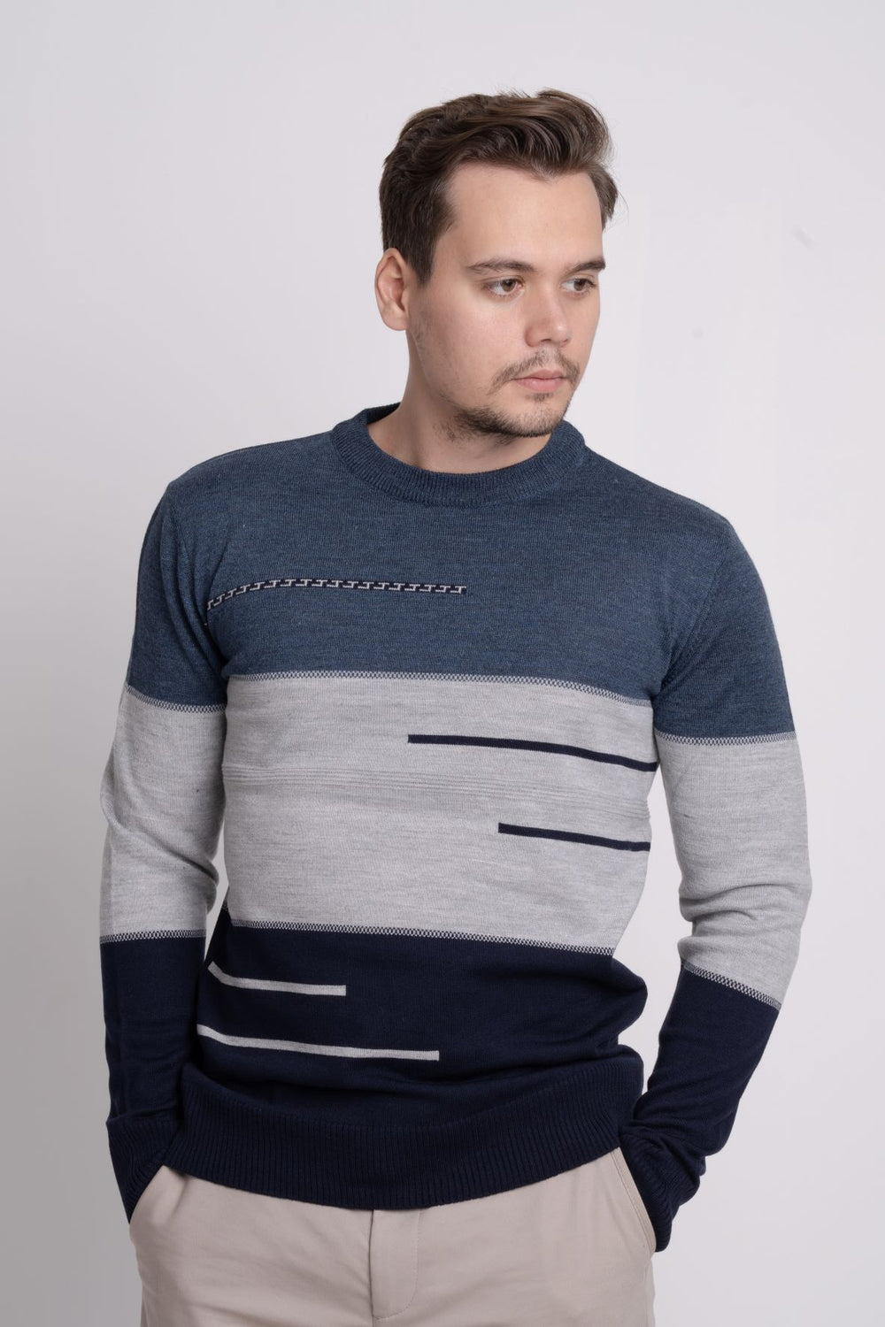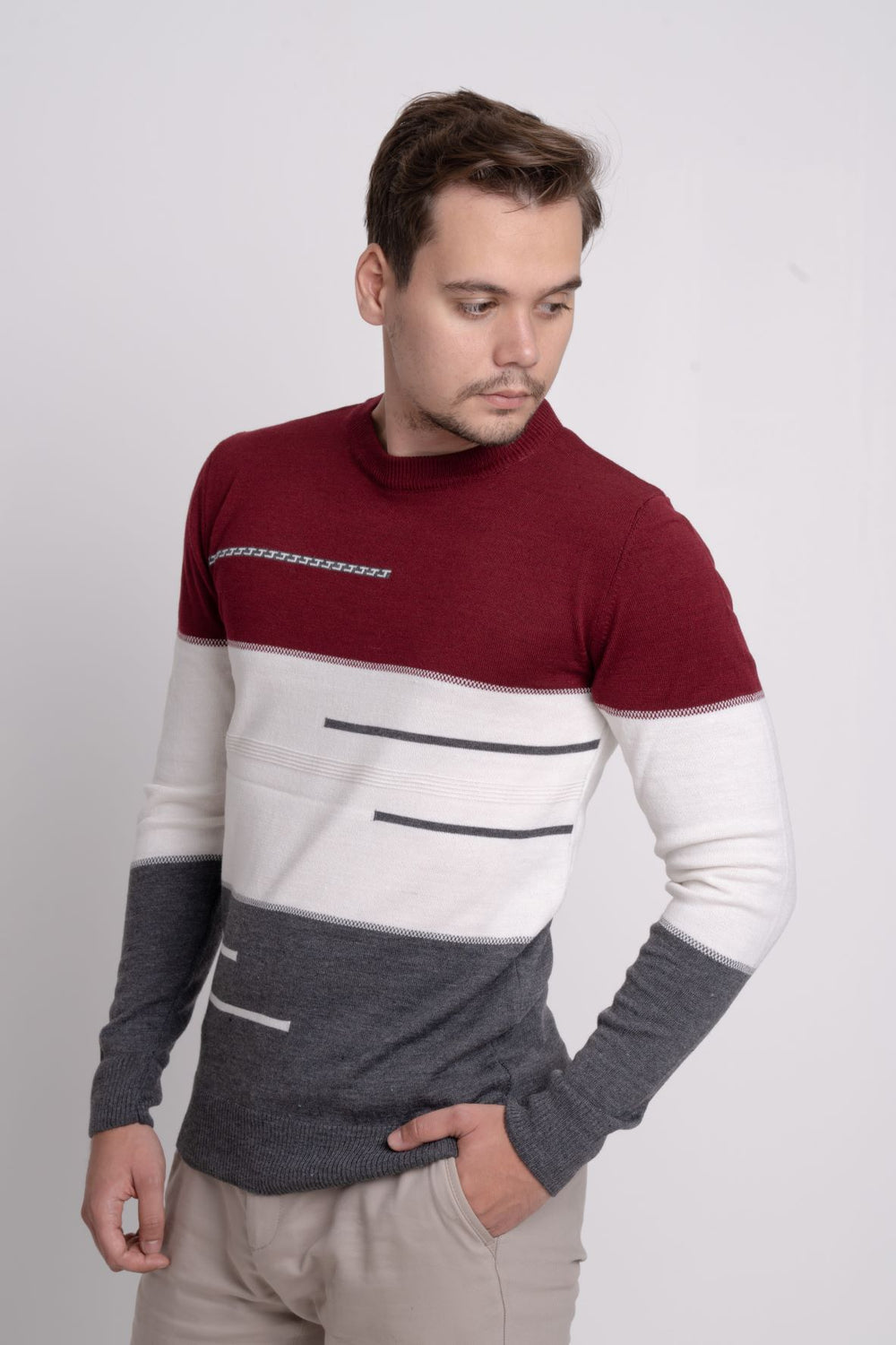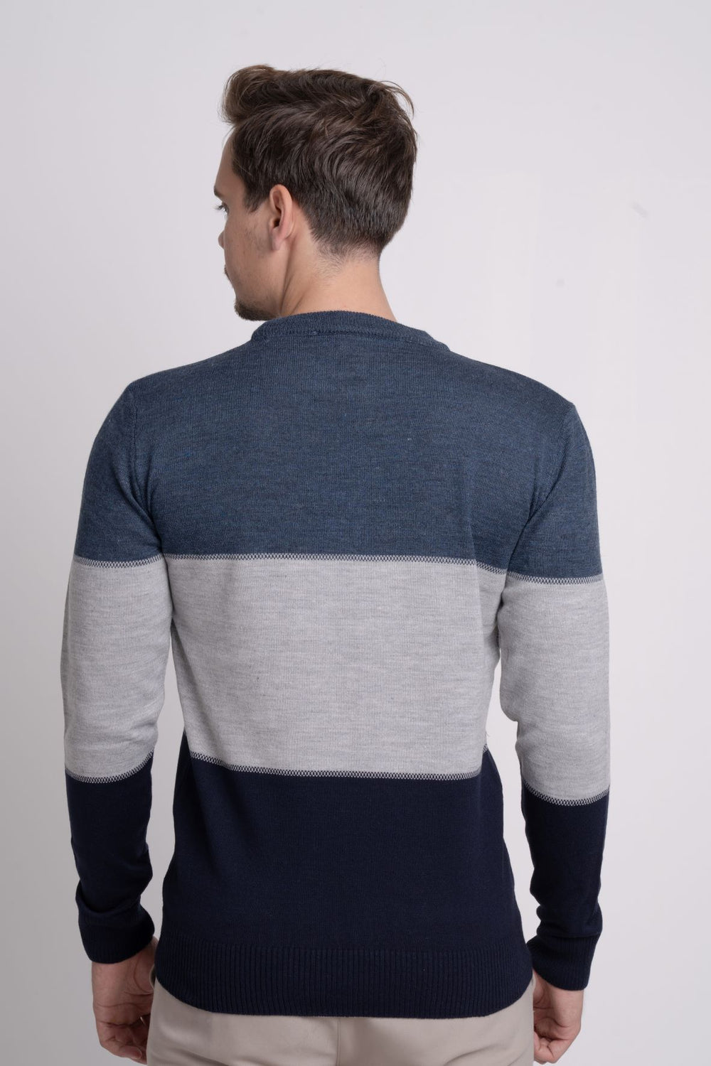 Renk bloklu üç renkli ince triko kazak, bisiklet yaka tasarımı ve regular fit kalıbıyla modern ve rahat bir stil sunar. İnce ve baharlık yapısı sayesinde sezon geçişlerinde kullanım için idealdir.
