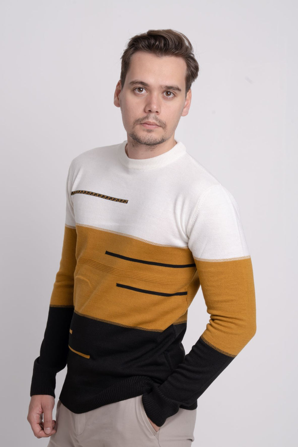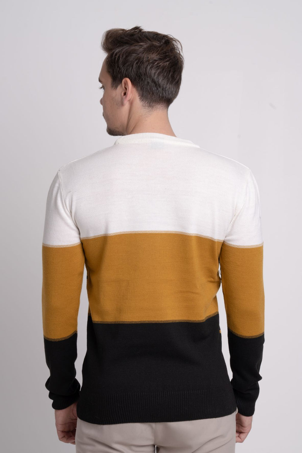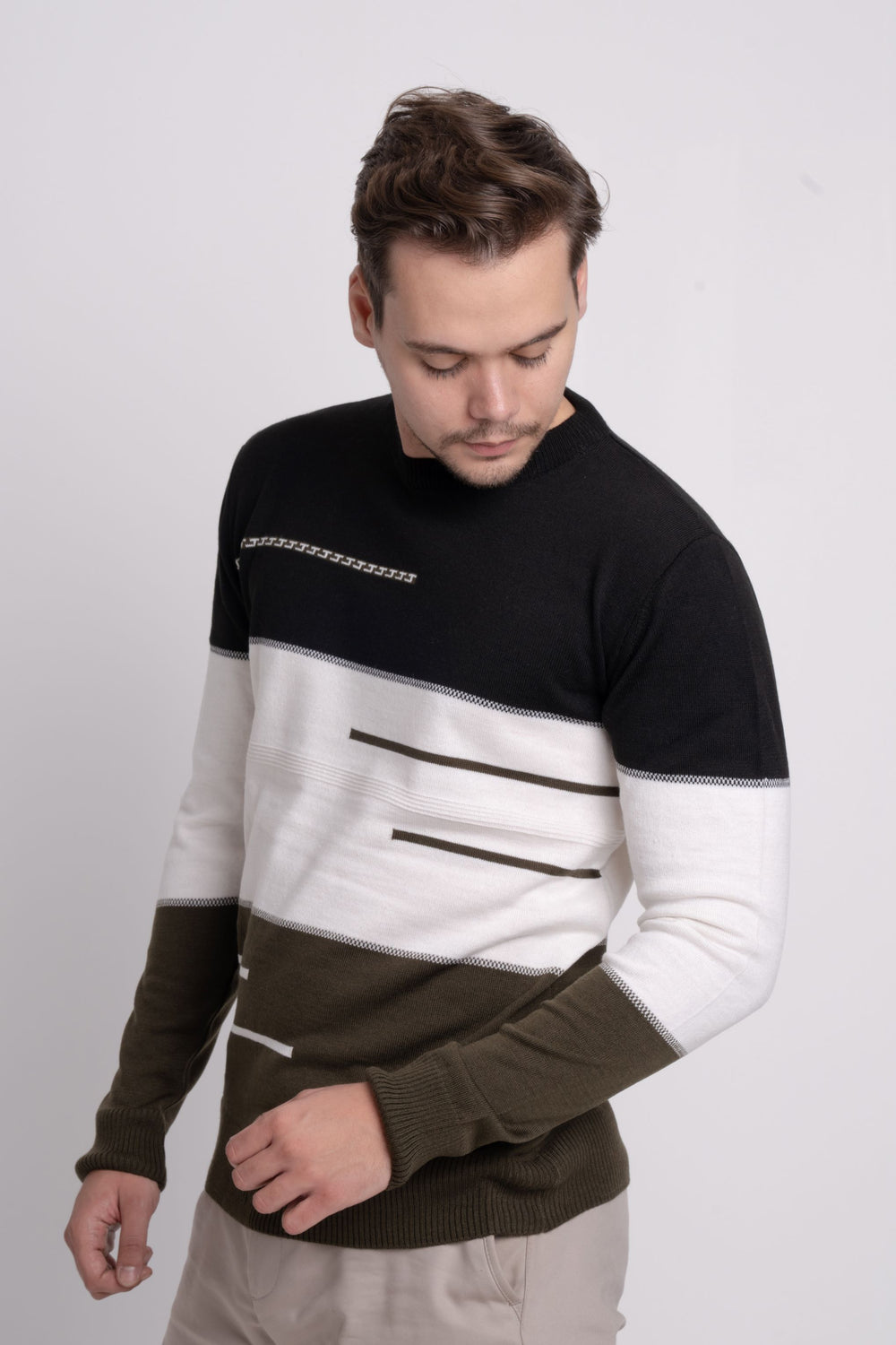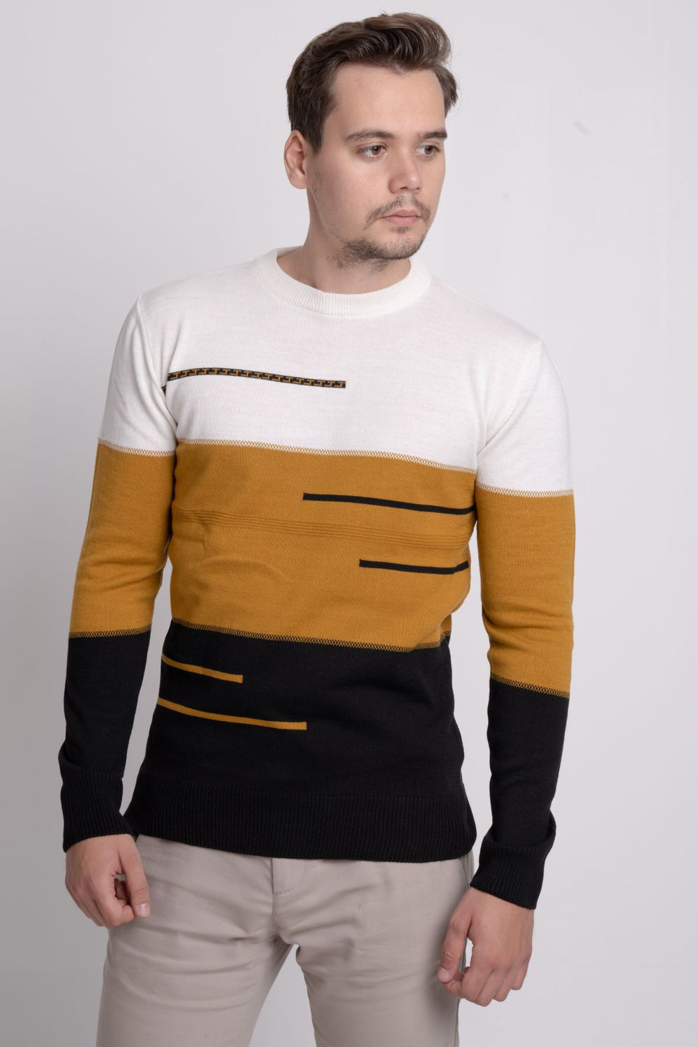 Renk bloklu üç renkli ince triko kazak, bisiklet yaka tasarımı ve regular fit kalıbıyla modern ve rahat bir stil sunar. İnce ve baharlık yapısı sayesinde sezon geçişlerinde kullanım için idealdir.