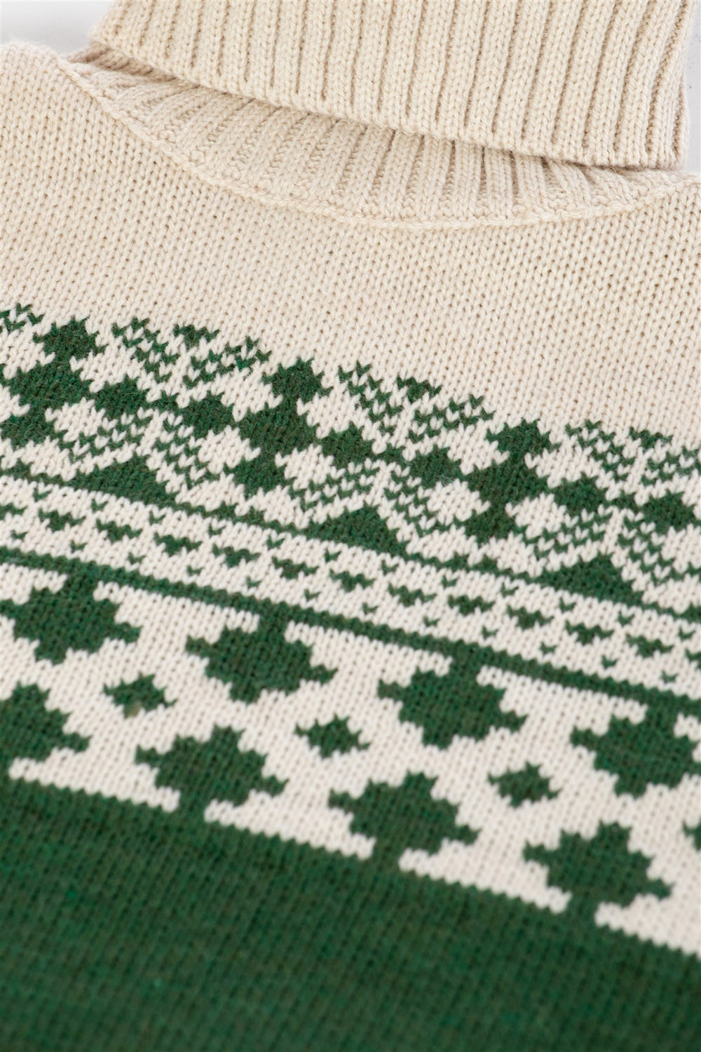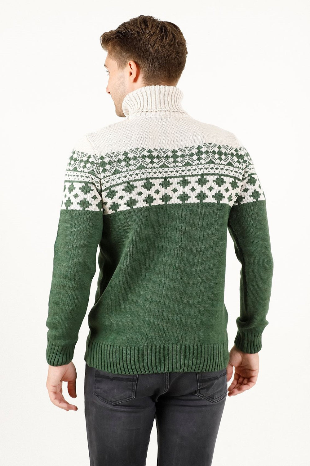 İki renkli jakar desenli triko kazak, balıkçı yaka tasarımı ve regular fit kalıbıyla modern ve rahat bir stil sunar. Kalın yapısıyla kış aylarında kullanıma uygundur.