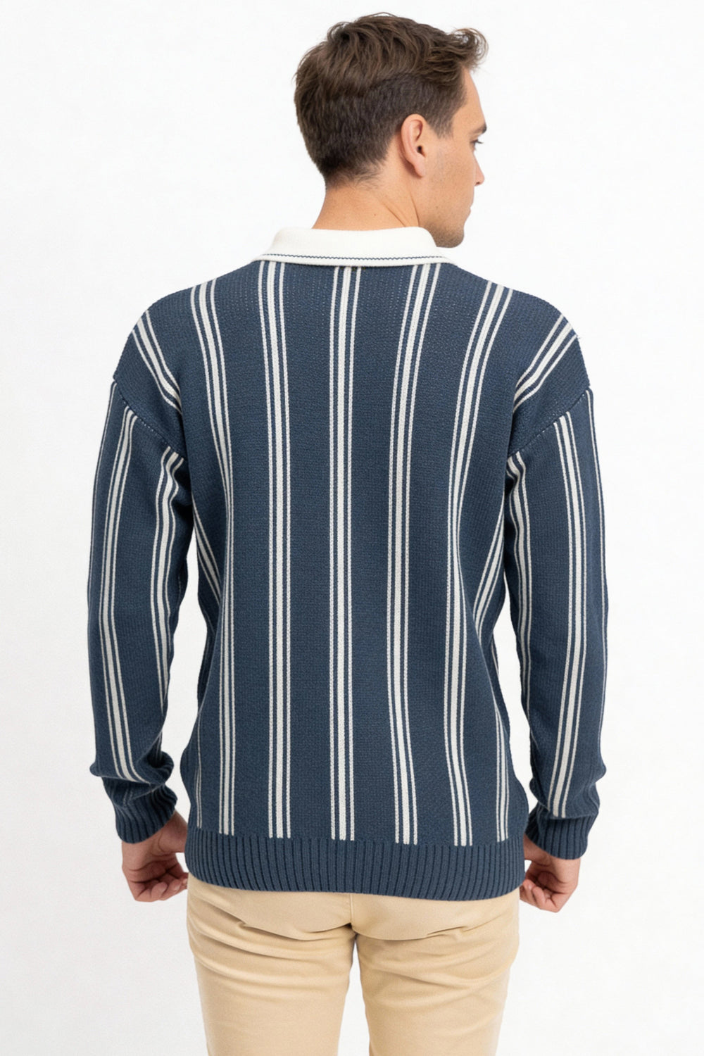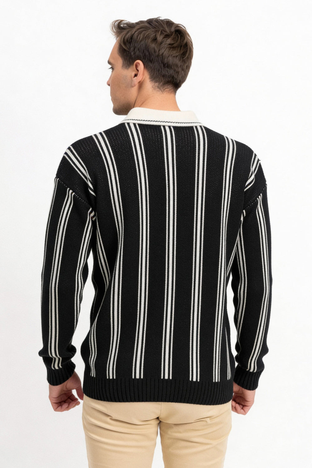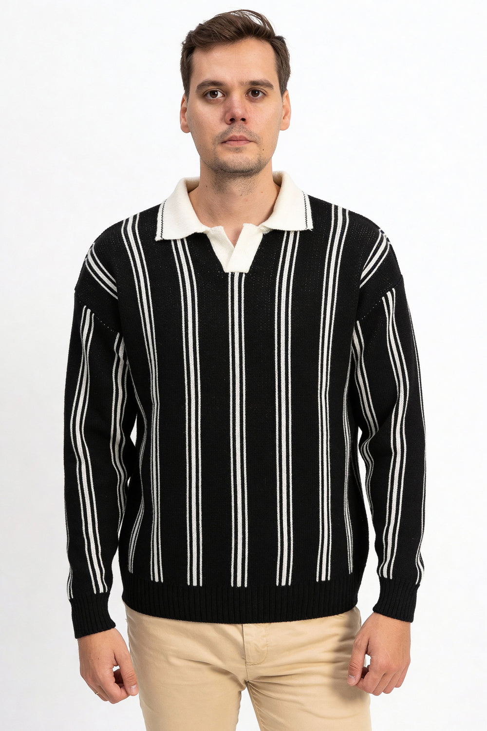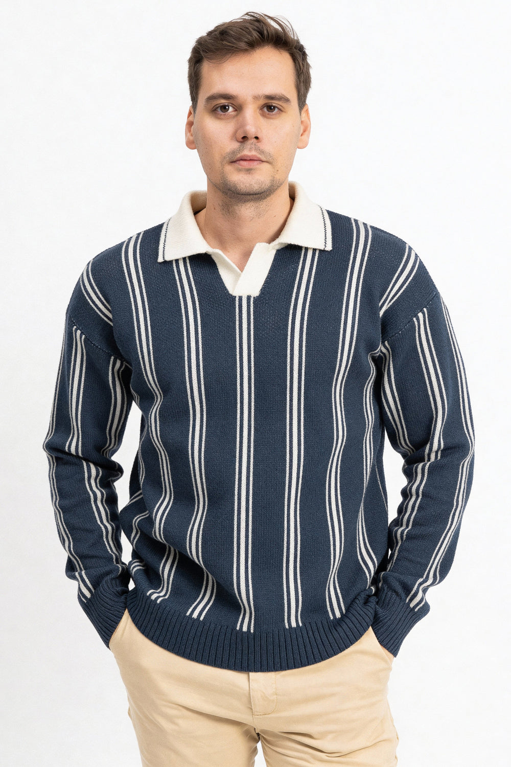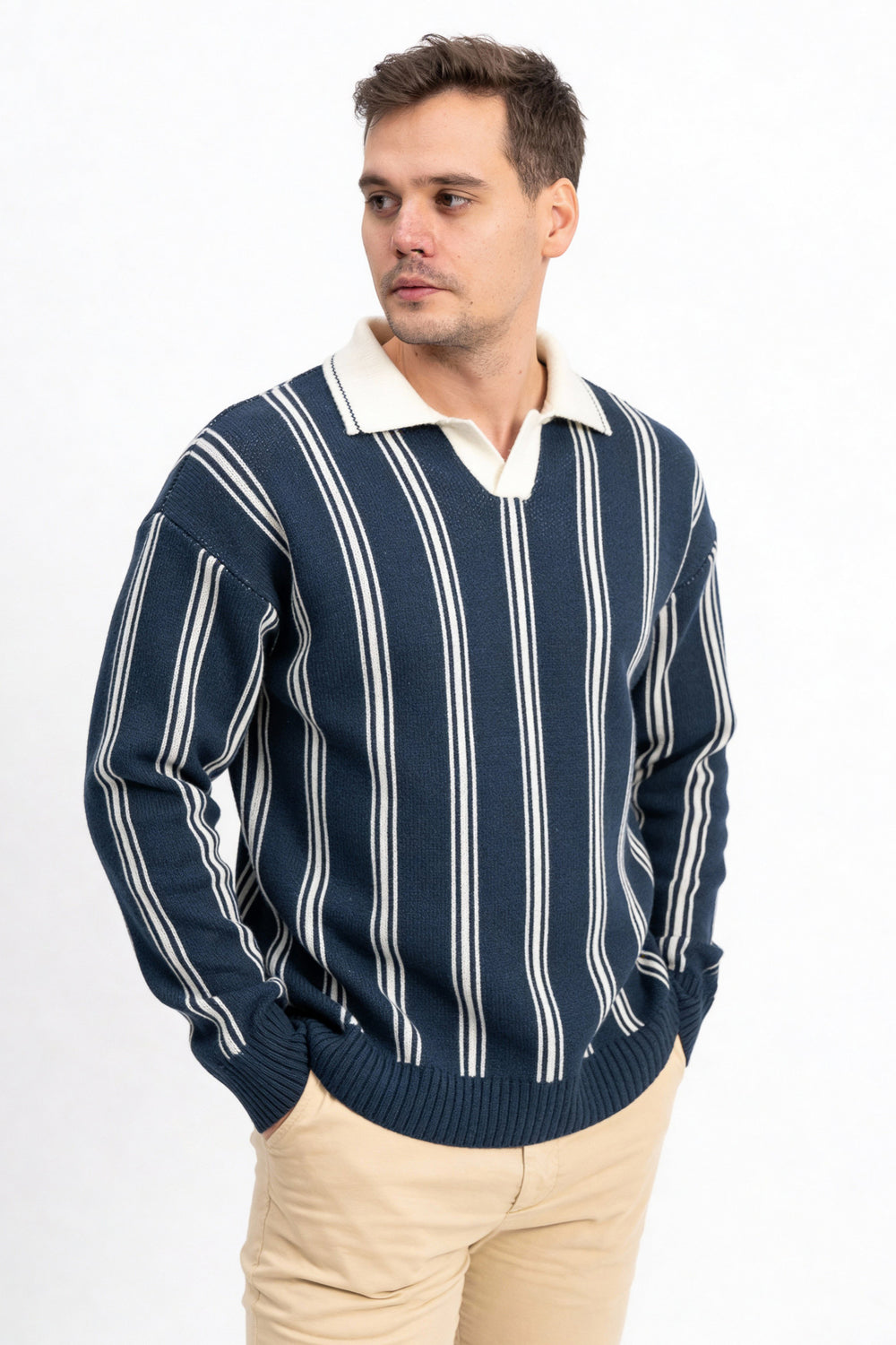Dikine çizgi dokusuyla hareket kazanan bu triko kazak, düğmesiz polo yaka formuyla genç ve modern bir görünüm sunar. Kalın yapısı soğuk havalarda sıcak tutarken, regular fit kalıbı gün boyu rahat bir kullanım sağlar.